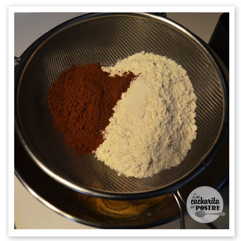 5. Ahora tamiza los ingredientes sólidos encima de la masa usando un colador: el cacao, la harina, la pizca de sal y el bicarbonato.