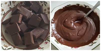 1. - Precalentamos el horno a 170º. Y troceamos el chocolate y lo fundimosa baño María o en el microondas, yo lo hago en el micro, de 30 en 30 segundos,y removiendo muy bien, hasta que quede entero homogéneo. Y apartamos.