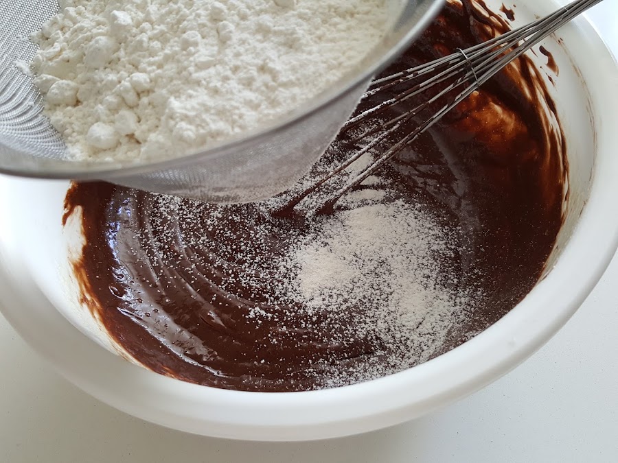 5. - Tamizamos la harina junto con el cacao y la levadura sobre la mezcla y removemos.