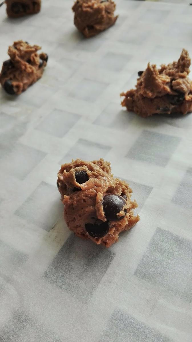 Con dos cucharas vamos cogiendo porciones de masa y vamos depositando sobre la bandeja cubierta con papel de horno
