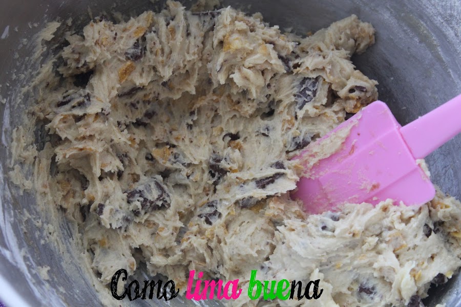 Una vez que obtenemos la masa, agregamos la vainilla y por último los cereales (aplastados un poco) y el chocolate.