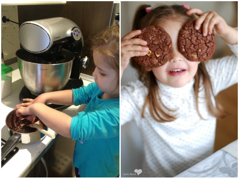 Como ya sabéis, mi socia Ana no tiene problema ninguno en meter las manos en la masa, así que aceptamos el reto encantadísimas. La receta de Cookies que os proponemos es completamente recomendable para hacerla con los niños, porque es muy sencilla y rápida de hacer. Y tengo que decir que el olor a chocolate que se impregna por toda la casa mientras se hornean es puro amor.