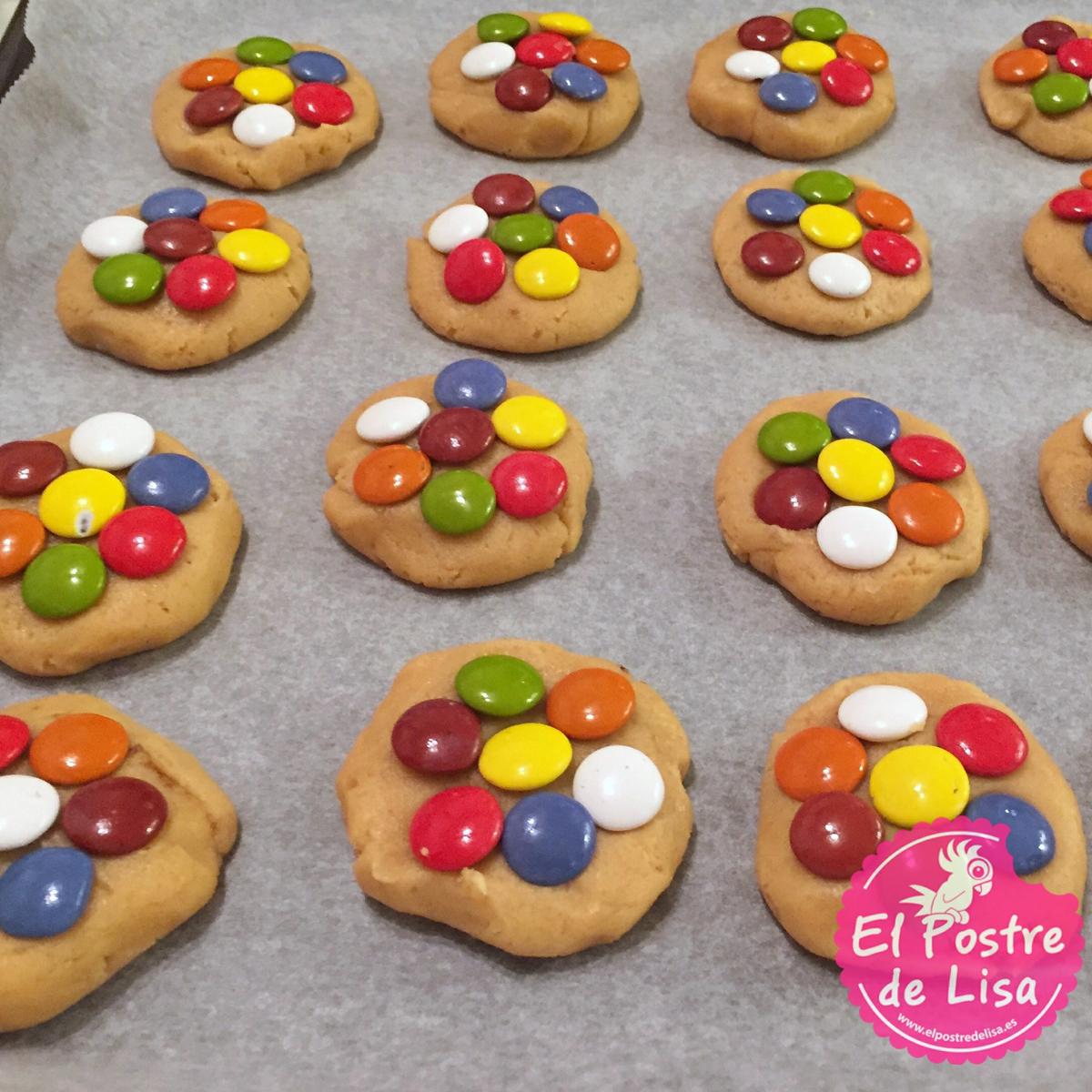Cuando tengamos nuestra masa con todos los ingredientes bien integrados, iremos formando bolas, las aplastaremos y colocaremos los lacasitos juntos, ya que una vez horneados se separarán un poco