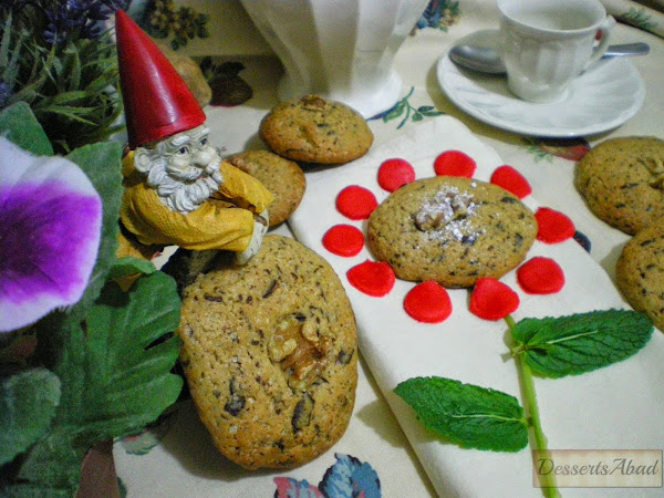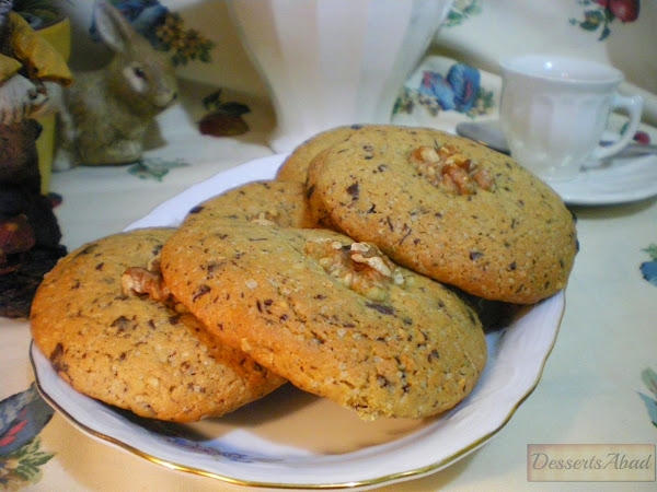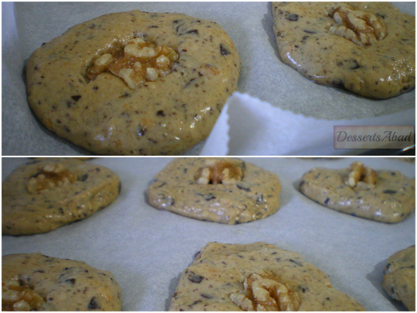Precalentar el horno a 180ºC (arriba y abajo). Formar bolas del tamaño de una trufa y ponerlas en la bandeja sobre el papel de horno, dejando un espacio de unos 5 cm entre ellas para que no se peguen entre sí. Decorar con nueces y hornear unos 8-10 minutos o hasta que estén dorados los bordes.
