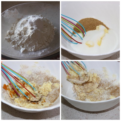En un bol ponemos la mantequilla, los azúcares y la piel de naranja rallada. Mezclamos bien hasta integrarlo todo.