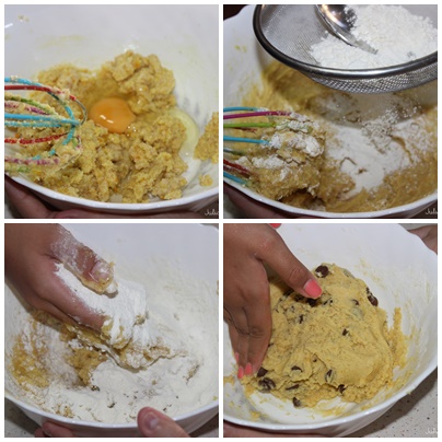 Agregamos la harina y mezclamos con las manos. Añadimos las pepitas de chocolate dejando unas poquitas para decorarlas por encima.
