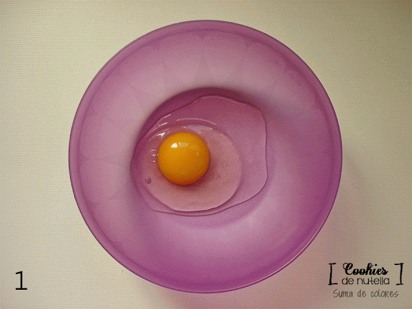 En un bol batir bien con unas varillas el huevo el azúcar moreno y la vainilla. Luego añadir la crema de cacao y la mantequilla y remover bien.