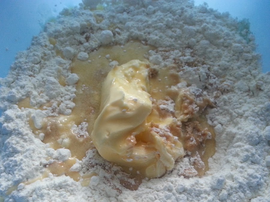 2. - Añadimos la harina y el bicarbonato junto con la mantequilla, yo la he metido en el microondas un minuto.