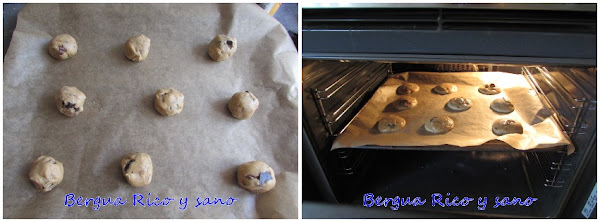 8. ¡A hornear! El horno debe estar precalentado a 180º y a las galletas les daremos 9 minutos, como mucho 11, si tu horno va flojito, con calor arriba y abajo, sin ventilador, y en la mitad del horno. Si te pasas también estarán buenas, pero ya no tendrán la textura húmeda y blandita por dentro. Son muy frágiles recién salidas del horno, por cierto.