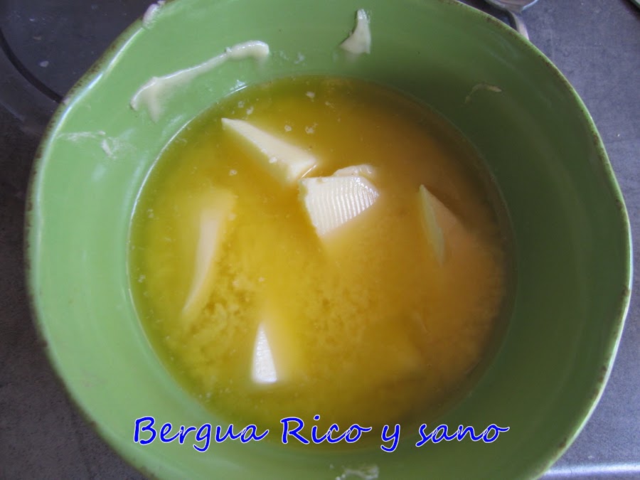 1. Fundimos la mantequilla en el microondas o al fuego; ¡que no hierva! Calentamos hasta que más de la mitad se haya fundido y el resto esté blando y se funda con el calor residual al remover. Menos de un minuto en el microondas debería ser suficiente para esta cantidad.