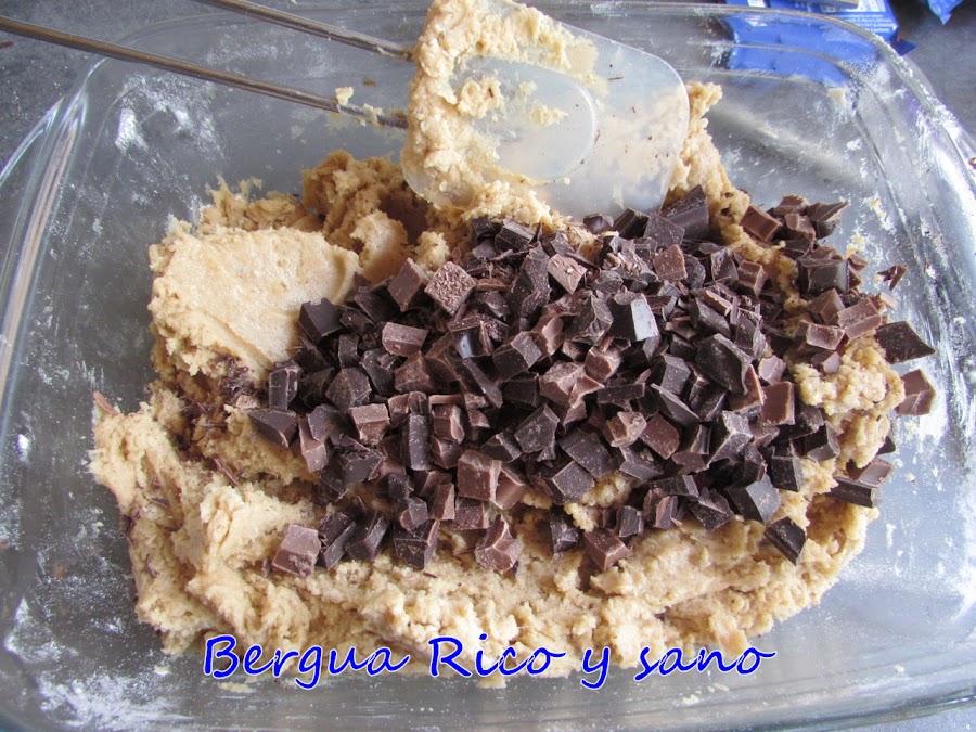 5. Ahora incorporamos los trozos de chocolate y mezclamos. Como digo, no hace falta que sean chips, vale con una tableta de chocolate troceada a cuchillo. Y yo mezclo chocolate puro y con leche para no pasarme de dulce y crear contraste.