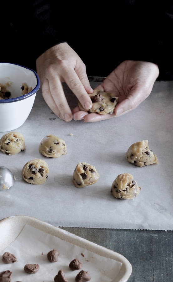 Para ambos procesos, hacemos bolitas con la cuchara de helados (unos 30 gr c/una) y en el centro colocamos una bolita de nutella congelada.