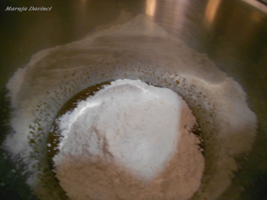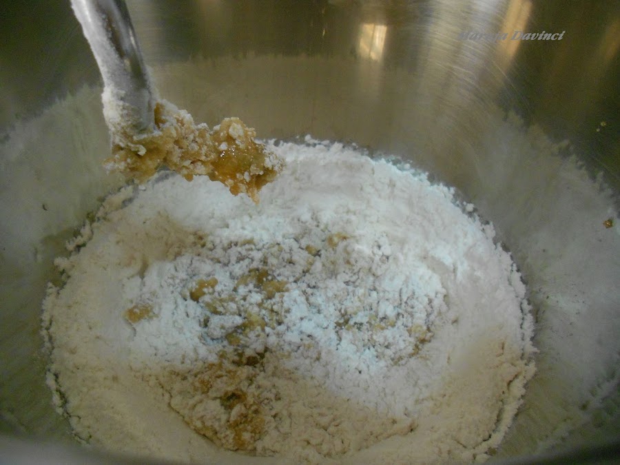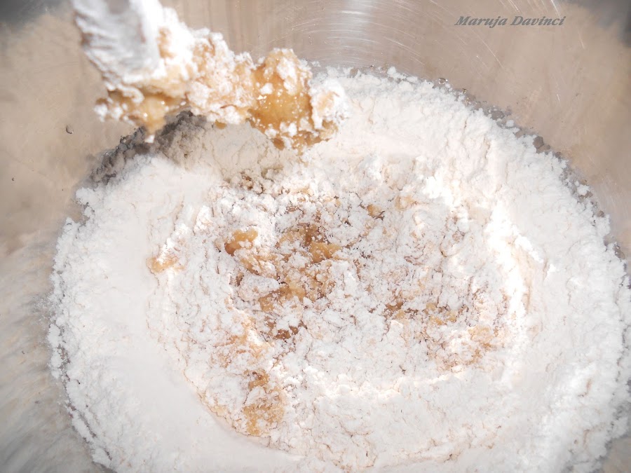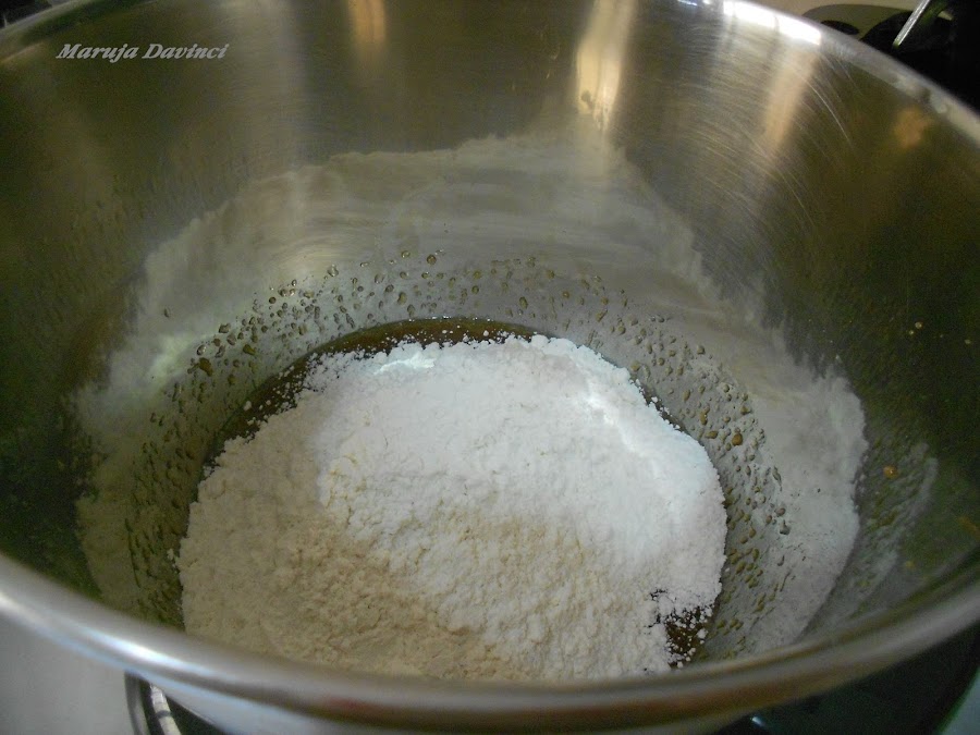 Mezclar la harina tamizada con la levadura y añadir a la mezcla