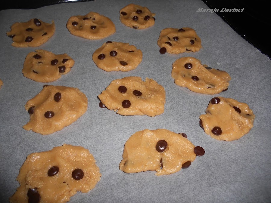 Coger pellizcos de masa y hacer bolitas que leugo aplastais. Si os mojais las manos con agua es mas sencillo, truqui, truqui. Poned en una bandeja para horno sobre papel de hornear.