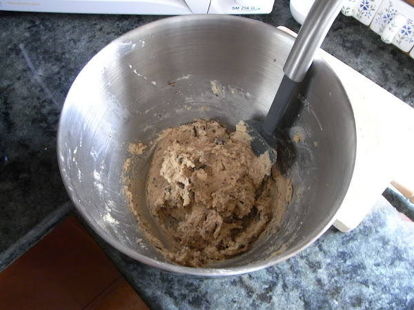 Batir la mantequilla con los azúcares hasta que quede esponjosa. Añadir el huevo y la vainilla y batir hasta que se integre todo. Añadir la mezcla de ingredientes secos. Remover con una espátula hasta integrarlo todo e incorporar el chocolate.