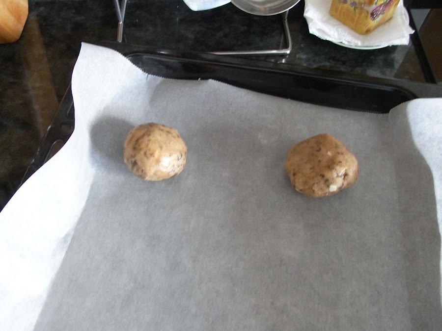Se saca la bola de la nevera y se hacen bolitas más o menos como un huevo, hay que tener en cuenta que estas galletas son grandes pero el tamaño lo decidís vosotros, yo hice 6 más grandes y otras medianas.