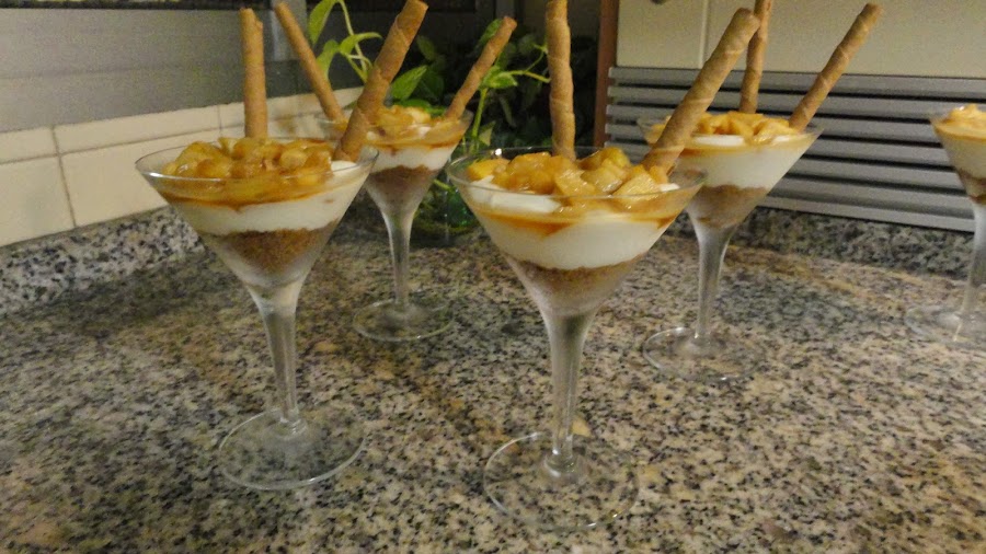 SEGUNDA PLANTA: mezclamos el queso crema con el azúcar glass y el medio brick de nata (crema de leche), removemos hasta obtener una crema homogénea. Y colocamos en las copas.