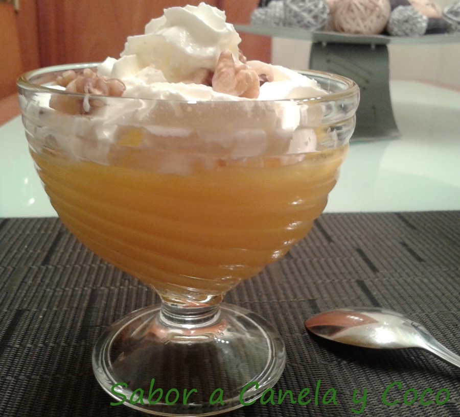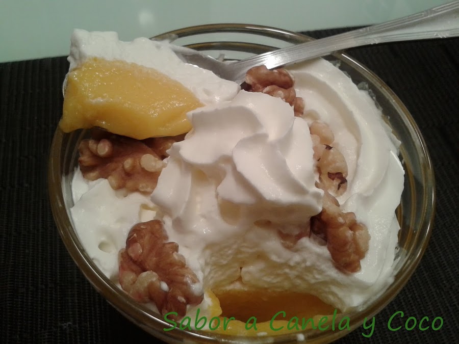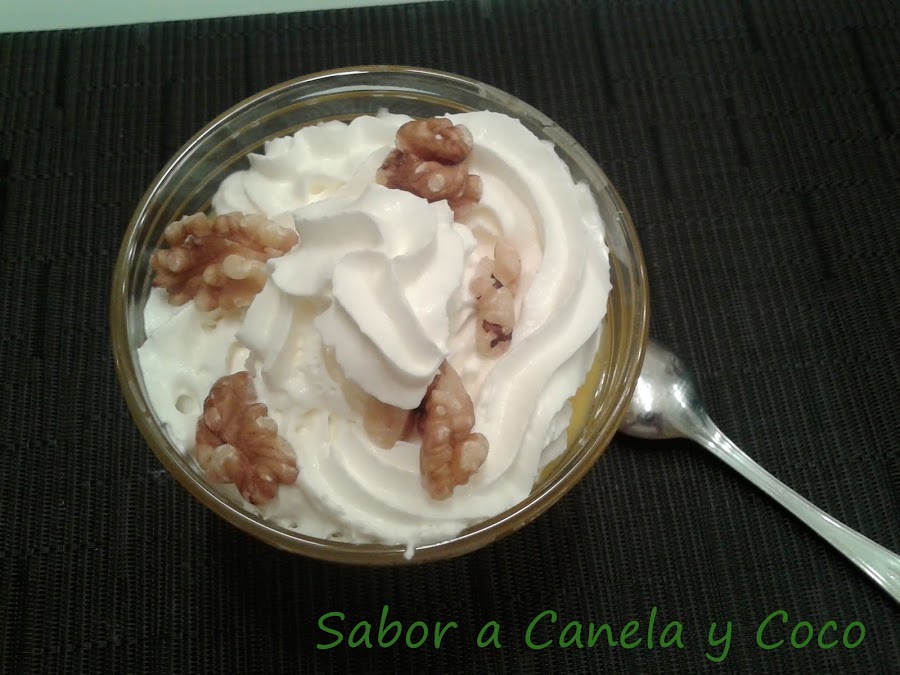 Servirla fría de la nevera y acompañamos con nata montada (crema de leche), unas nueces por encima y un chorrito de miel, Deliciosa!!!!