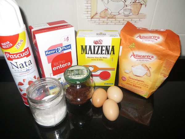 Echamos todos los ingredientes, excepto la nata montada (crema de leche) y los fideos de chocolate, en un bol y batimos bien hasta que todos los ingredientes están bien integrados y no quedan grumos de la maicena. A continuación, lo metemos al microondas durante 6 minutos a máxima potencia.