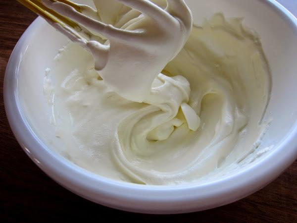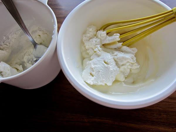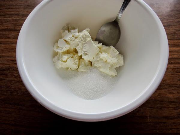 Con las mismas varillas que montamos la nata (crema de leche), mezclamos en un bol el queso con el azúcar hasta que nos quede una crema suave.