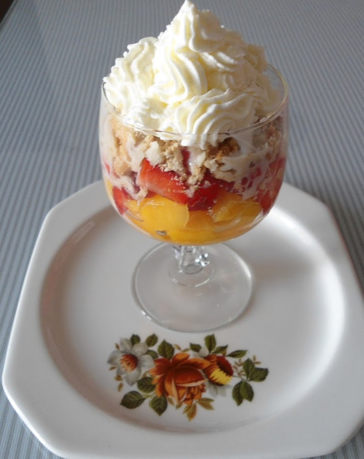 Las galletas se desmenuzan, los melocotones y las fresa se cortán en trocitos y se monta la nata (crema de leche).