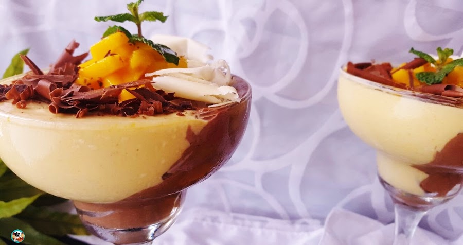 3.- Pelamos los mangos (reservamos la mitad de un mango para decorar) Cortamos a cuadros la fruta y la trituramos con el brazo de la batidora. Mezclamos la pulpa de la fruta con el resto de la nata montada (crema de leche). Rellenamos las copas con la mousse de chocolate que hemos guardado en la nevera y la mousse de mango. Decoramos con unas virutas de chocolate negro y chocolate blanco. Cortamos la mitad del mango que hemos reservado a cuadro y decoramos las copas con la fruta. Guardamos en la nevera 2 horas, finalmente le ponemos una ramita de hierbabuena fresca.