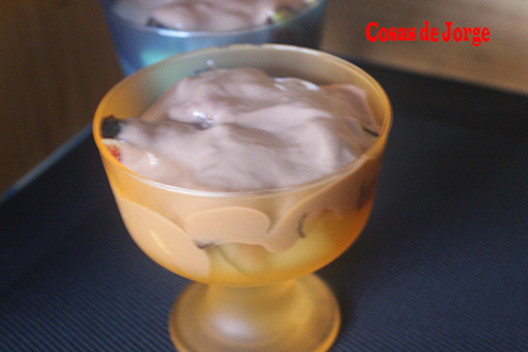 Repartimos las frutas entre dos copas y cubrimos con el yogur azucarado.
