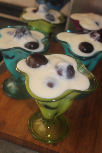 Aunque el menjar blanc se come sin añadidos, en esta ocasión he optado por servirlo en copas, previamente llenas de cerezas deshuesadas.