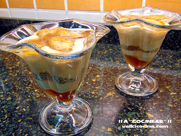 Por último montamos nuestra copa añadiendo en el fondo una cucharada de caramelo .., a continuación una de crema, encima otra de galletas, .. y completando con más crema.