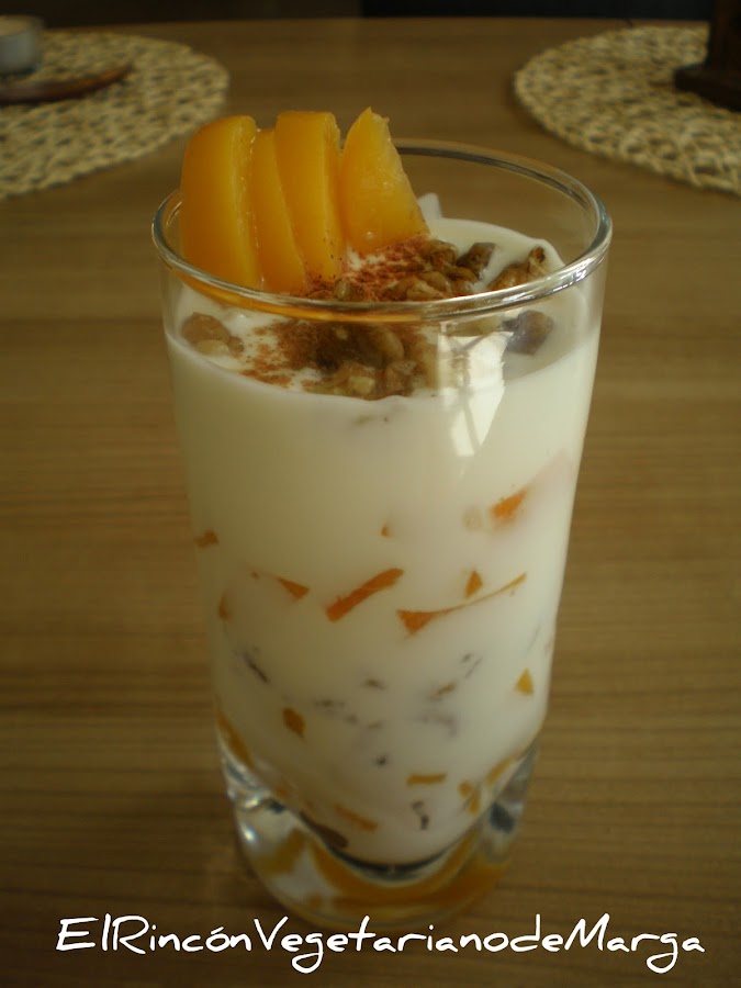 Cortamos en daditos el melocotón. Ponemos el yogur en un bol, los trocitos de melocotón, las nueces y un chorro del almíbar (para endulzar el yogur), lo mezclamos bien. Lo servimos en una copa o vaso alto con canela.