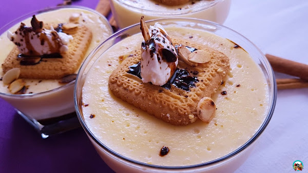 3.-Dejamos reposar el postre 1 hora en la nevera, servimos el postre con una cucharada de yogur griego, la mitad de una galleta de soletilla y un poco de café soluble por encima.