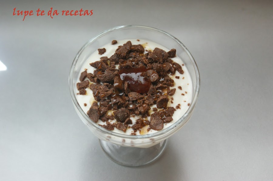En la base de la copa ponemos la mermelada y sobre ella el yogur, por último ponemos los cereales triturados y un chorrito de miel y mermelada.