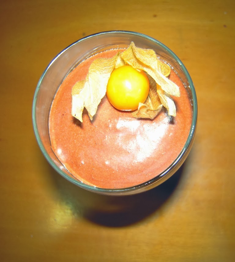 Se vuelve a meter al frigorífico unas tres horas y por último se adornan con una fruta de algún color que contraste con el negro, yo he utilizado physalis, que compré en el Lidl, pero podéis poner una frambuesa, fresa, lo que queráis.