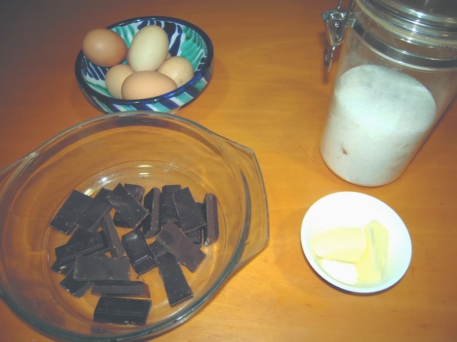 Mousse de chocolate negro: 200 gr. de chocolate negro, 30 gr. de mantequilla, 6 cucharadas de azúcar y 6 huevos.