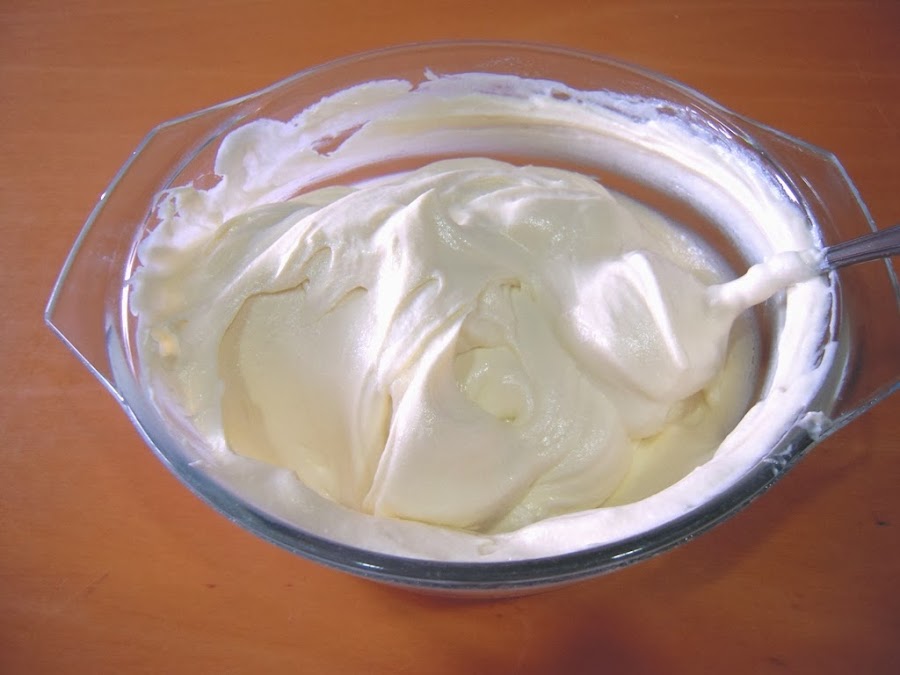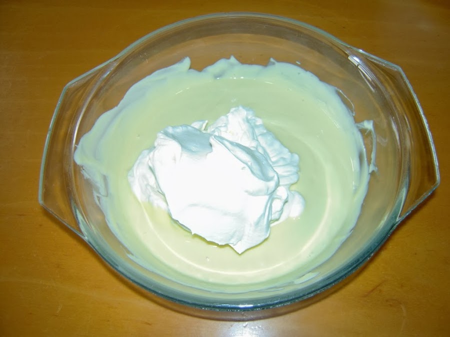 Luego se añade con cuidado la nata (crema de leche) restante. Hay que hacerlo con movimientos suaves y envolventes para dar volumen a la mezcla.
