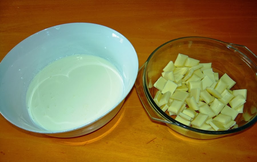 Mousse de chocolate blanco: 270 gr. de chocolate blanco y 300 ml. de nata (crema de leche) para montar que esté bien fría.