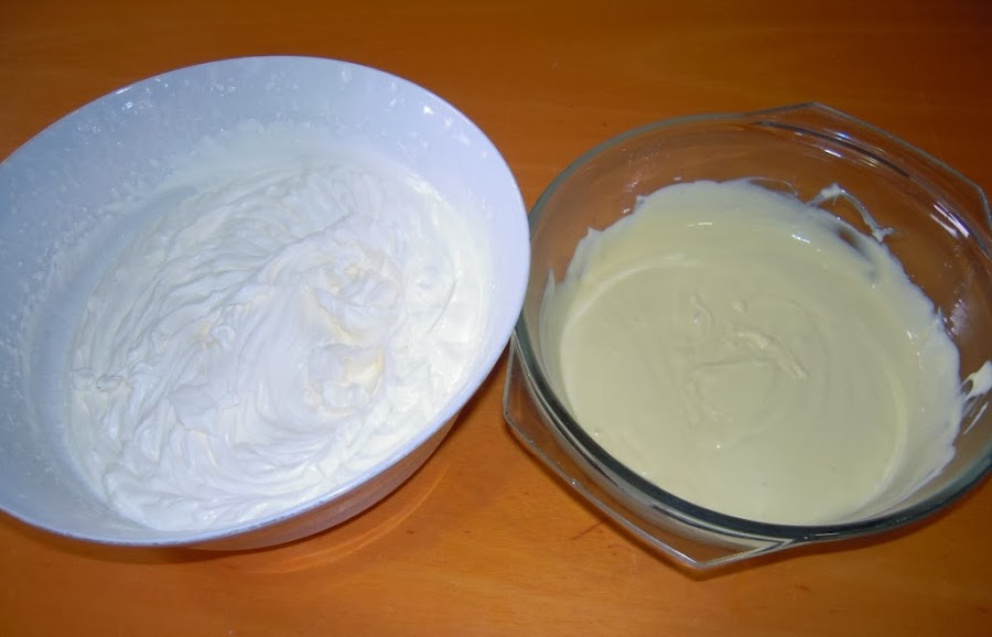 Os daréis cuenta de que la consistencia de las mousses es diferente, la blanca es más espesa, esto es para que la de chocolate negro no chafe la de chocolate blanco.