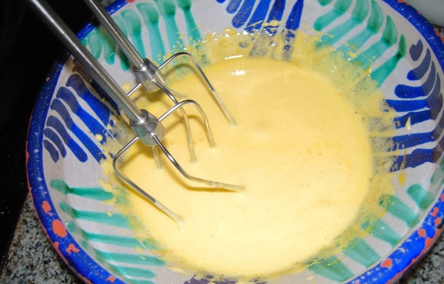 Para ello, se derrite el chocolate con la mantequilla y se reserva. Luego batimos con las varillas las yemas junto con 4 cucharadas de azúcar hasta conseguir una mezcla espumosa y blanquecina. La mía no ha salido muy blanca porque he utilizado huevos ecológicos y las yemas son mucho más amarillas que las de los huevos de granja.