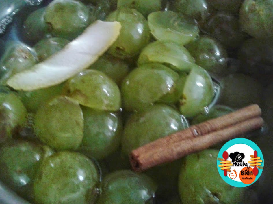 1.- Lavamos las uvas, las abrimos por la mitad y le quitamos las semillas. En una cacerola grande las ponemos a cocer con agua,la canela. la corteza de limón, el vino moscatel y el azúcar. Las cocemos 2 horas.