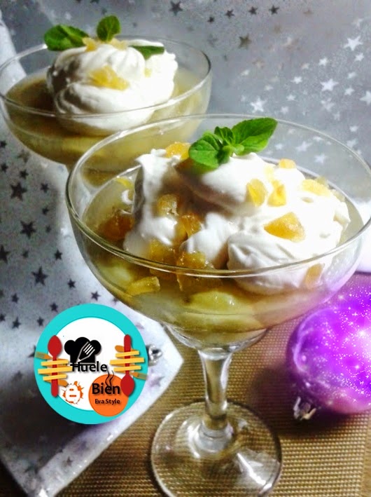 3.- Las repartimos en copas o vasos de cristales. Las dejamos reposar 6 horas en la nevera. Montamos la nata (crema de leche) con el bote de Ermol y la nata (crema de leche) liquida, la mezclamos con el yogurt. Repartimos la nata (crema de leche) en las copas. Picamos el jengibre confitado, lo repartimos en las copas y decoramos con las hojas de menta. También puedes decorarlas con una ramita de hierbabuena.