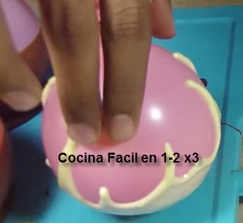 4. sumergir el globo en un bol con chocolate derretido (debe estar tibio) si esta caliente puede reventar el globo