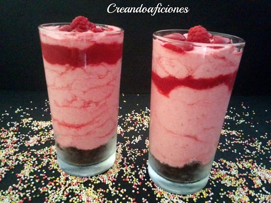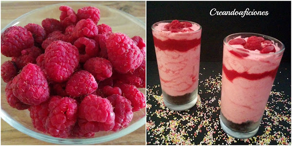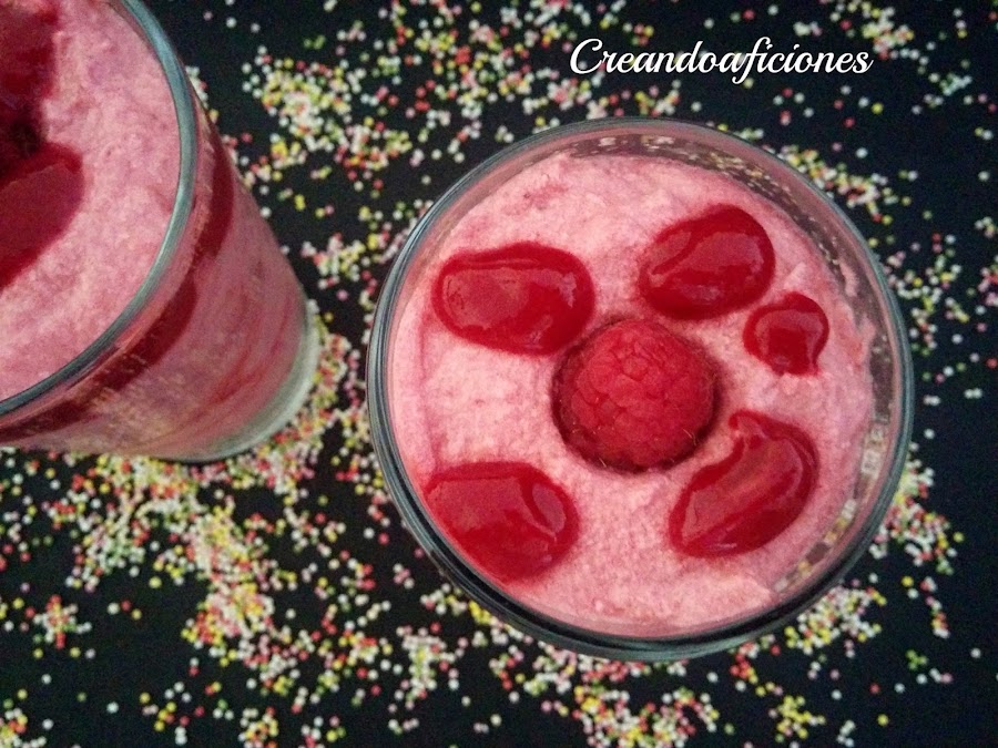 Lo sacamos de la nevera y montamos, ponemos la nata (crema de leche) de frambuesas, un poco de salsa de frambuesas y más nata (crema de leche) de frambuesas. Decoramos con una frambuesa y un poquito más de salsa.Que disfrutéis!!!!!!!!!!!!!!!!