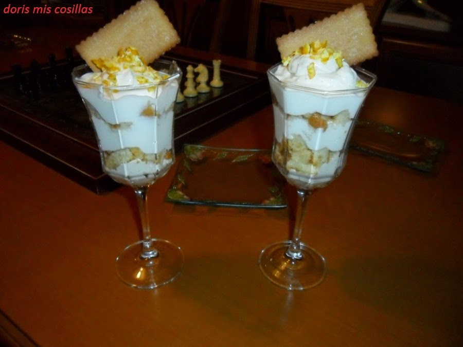 Acto seguido, agregamos una generosa capa de crema, con una cuchara y otra capa de bizcochos emborrachados de licor y otra capa de crema de queso.Esta última, la podemos poner con una manga pastelera y por último, repartir un poco de ralladura de naranja y una galleta de canela... o fideos de chocolate, para gustos los colores.