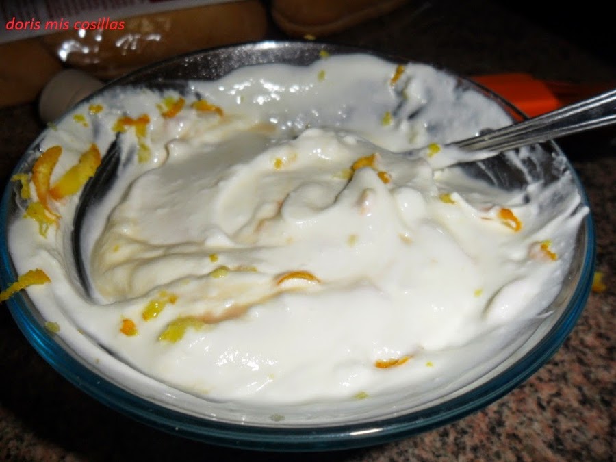 En un bol amplio, poner el queso mascarpone muy frío, batimos con las varillas manuales y agregamos los yogures, seguir batiendo mientras agregamos la vainilla azucarada en polvo, yo le he rallado un poco de naranja sin nada de blanco para que no amargue la crema. Es opcional.