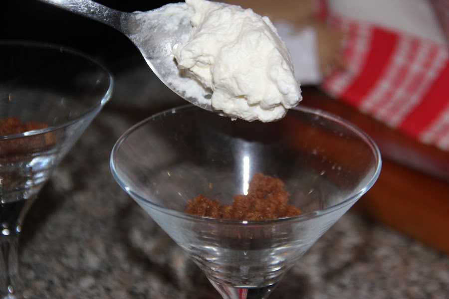 En la base de una copa ponemos galleta picada mezclada con mantequilla derretida.