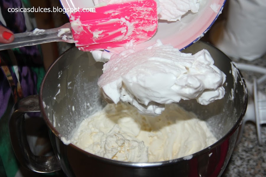 Agregamos las claras que previamente habremos montado a punto de nievo y mezclamos con movimientos envolventes. Reservamos.