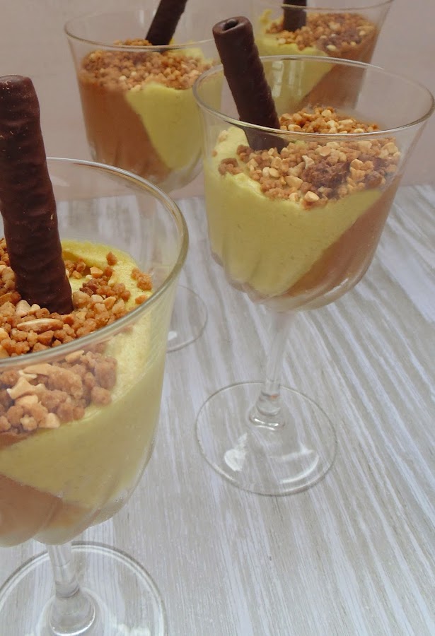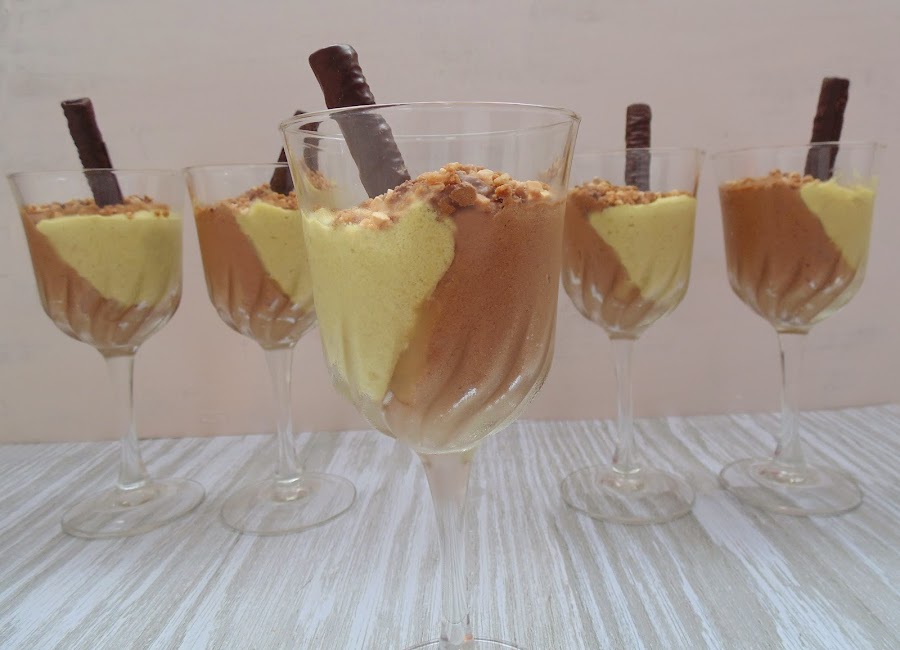 A veces tenemos que hacer un postre para una cena con amigos y no tenemos mucho tiempo. A veces tenemos prevista una cena muy copiosa y sabemos que si ponemos una supertarta de chocolate de postre, se quedará sobre la mesa, porque todo el mundo estará muy lleno para el postre. A veces simplemente tenemos ganas de una mousse de chocolate, pero queremos darle un toque especial. Para todas estas ocasiones, estas copas son ideales, fáciles y rápidas de hacer, y de un sabor exquisito. Solo hace falta que tengamos a mano una pasta concentrada de pistacho, y por supuesto, si en lugar de pistacho, preferimos otro sabor, simplemente hemos de cambiar la pasta por otra de nuestro sabor favorito.