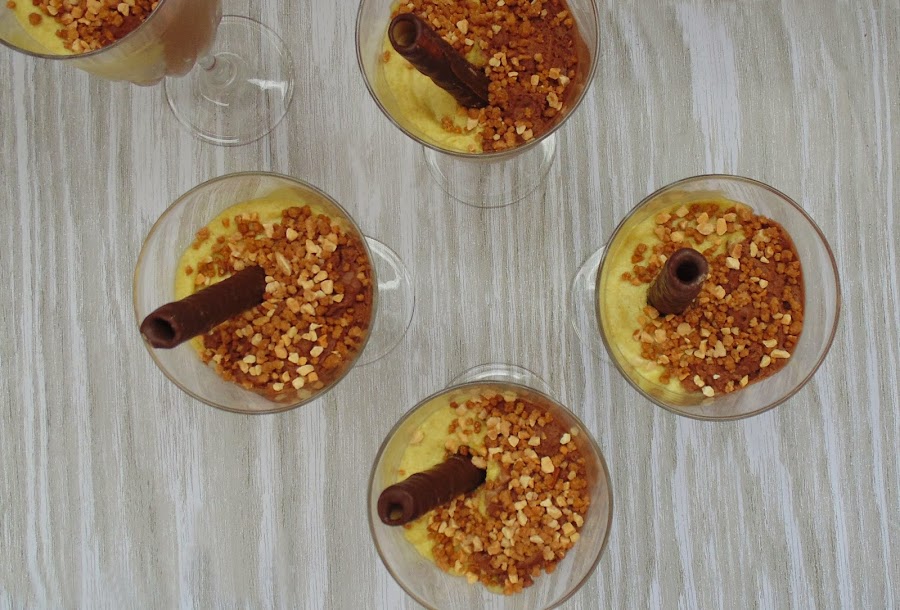 Decoramos con unos barquillos y unos trocitos de frutos secos (lo ideal serían pistachos, pero solo los encontré salados, así que utilicé almendras) y ya tenemos un postre muy fácil y de éxito garantizado.