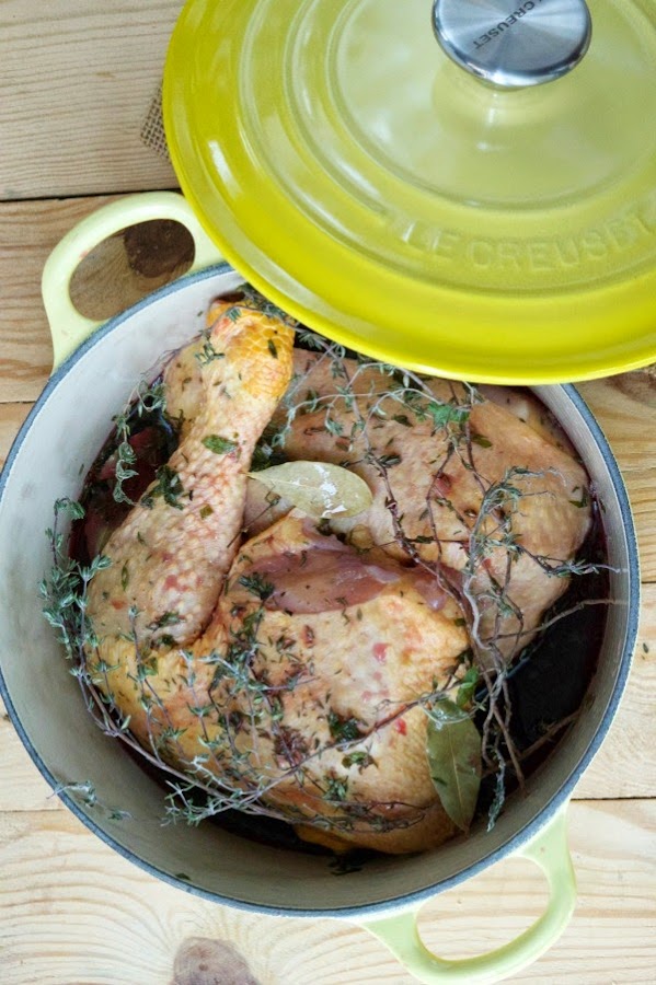 Este mes el reto de Cooking the Chef nos ha llevado hasta Francia y nos hemos sumergido en la cocina francesa de manos del gran chef Paul Bocuse. No conocía nada de este chef porque, ciertamente, la cocina francesa no me atrae mucho. En principio, pensaba en hacer un "ratatouille" pero vi este pollo y me quedé enamoradita de él. Así que, me puse manos a la obra y preparé este "pollo al vino" que quedó delicioso. Hasta mis peques se lo comieron todo, todito.