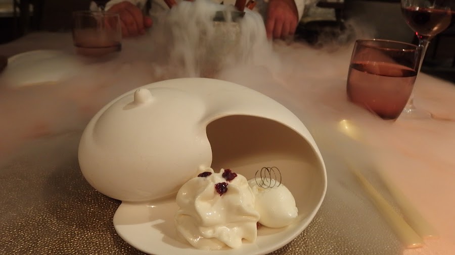 Aquí nos sirven, con una espectacular puesta en escena, el yogur ácido con arándanos y espuma de trebejo ahumada.